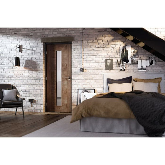 Enhance your home with the LPD Sofia 1L Glazed Internal Door, a perfect combination of modern design and practical functionality. The door features a warm walnut grain finish complemented by contrasting side panels, offering a stylish and contemporary look suitable for any interior style. The focal point of this design...